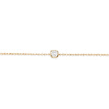 The first diamond is a treasured gift. Our delicate diamond bracelet features a single, cushion-cut white diamond in an 18 karat yellow gold rub-over setting held on a dainty gold chain. Handcrafted in Italy.